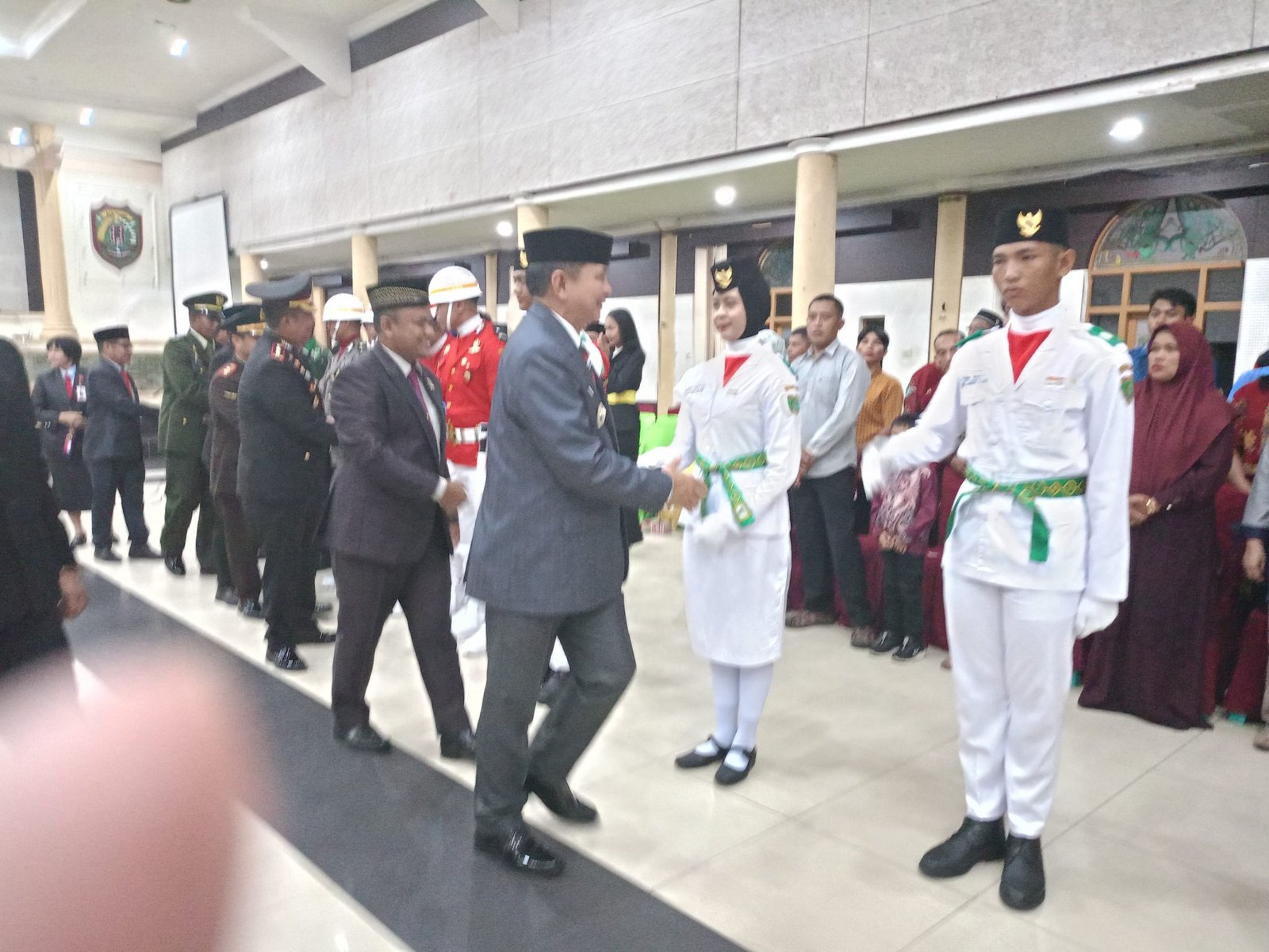 Suasana semakin khidmat ketika Bupati M. Yamin memasangkan kendit kepada perwakilan Paskibraka, sebagai simbol resmi pengukuhan mereka sebagai Pasukan Pengibar Bendera Pusaka Kabupaten Barito Timur.