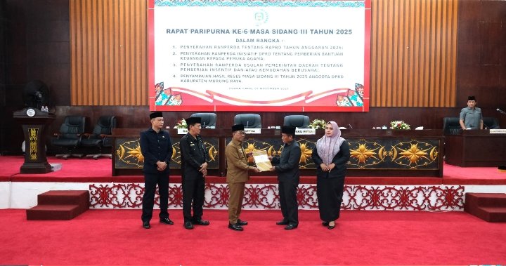 Ketua DPRD Murung Raya, Rumiadi, dalam sambutannya menyampaikan bahwa rapat paripurna kali ini memiliki empat agenda utama. Pertama, penyerahan Rancangan Peraturan Daerah (Ranperda) tentang Rancangan Anggaran Pendapatan dan Belanja Daerah (RAPBD) Tahun Anggaran 2026. Kedua, penyerahan Ranperda inisiatif DPRD mengenai pemberian bantuan keuangan kepada pemangku agama.