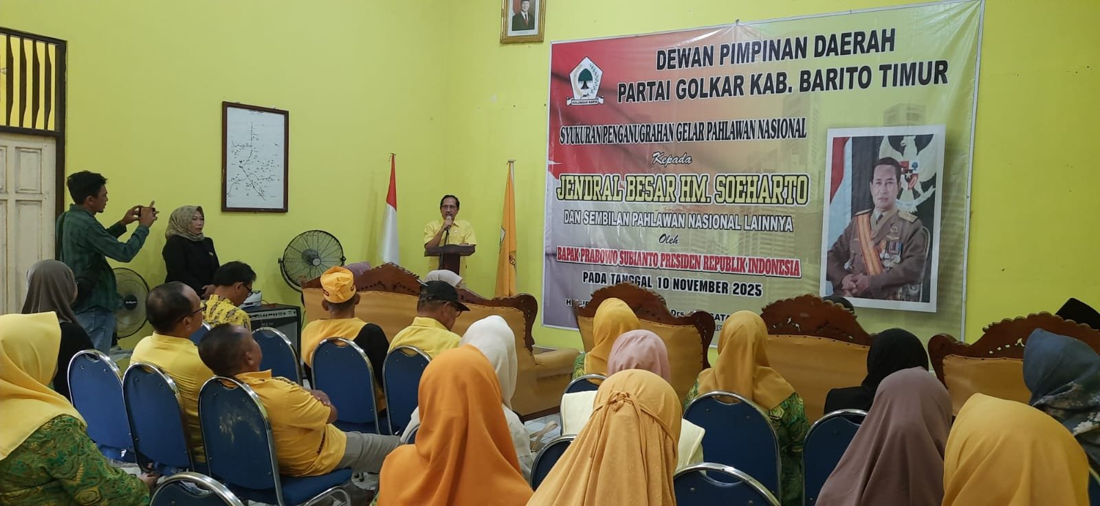 ASPIRASINEWS, Tamiang Layang — Pengurus Dewan Pimpinan Daerah (DPD) Partai Golongan Karya (Golkar) Kabupaten Barito Timur menggelar syukuran atas penganugerahan gelar Pahlawan Nasional kepada Jenderal Besar H. M. Soeharto bersama sembilan tokoh lainnya oleh Presiden Prabowo Subianto.
