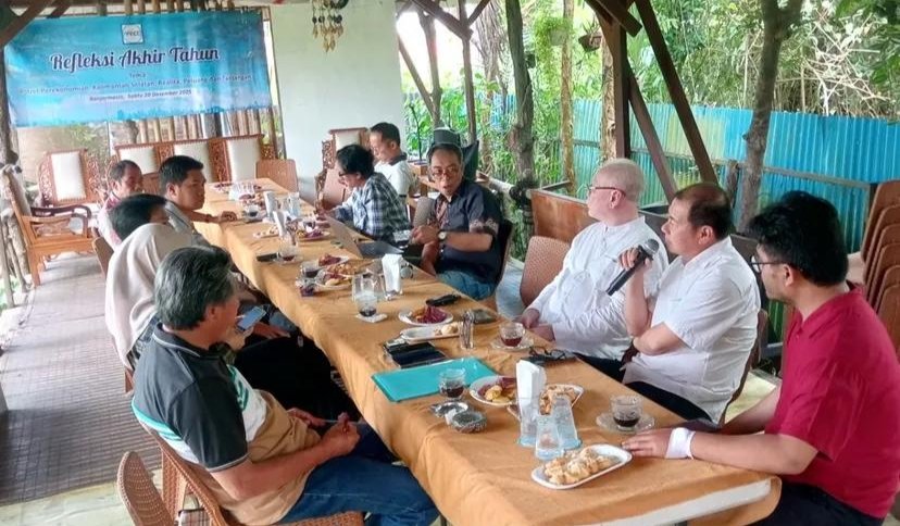 Sejumlah pengusaha yang tergabung dalam DPP APINDO (Asosiasi Pengusaha Indonesia) Kalimanatan Selatan, melakukan refleksi dan evaluasi terkait realitas, peluang dan tantangan berusaha di Kalimantan Selatan sepanjang tahun 2025, bertempat di Rumah Alam Sungai Andai, Banjarmasin (20/12/2025).