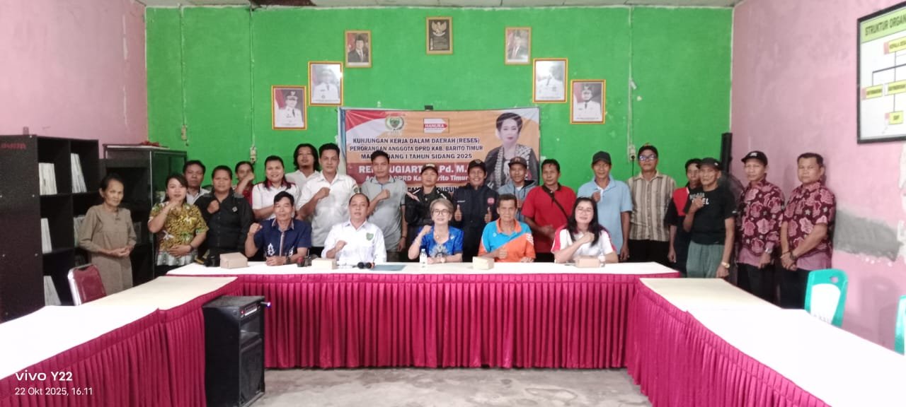 ASPIRASINEWS, Barito Timur – Anggota DPRD Kabupaten Barito Timur, Reni Sugiarti, S.Pd., M.M, melaksanakan kegiatan Reses di Desa Gumpa, Kecamatan Dusun Timur, pada Kamis (23/10/2025). Kegiatan tersebut dihadiri oleh Badan Permusyawaratan Desa (BPD), aparat desa, tokoh agama, tokoh masyarakat, tokoh adat, ketua RT, serta masyarakat setempat.