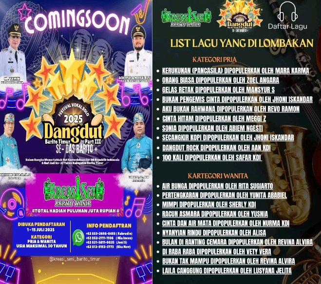 ASPIRASINEWS, BARITO TIMUR – Komunitas Kreasi seni Barito Timur akan segera melaksanakan Festival Vokal Solo Dangdut 2025 part III se- Das Barito. Kegiatan rutin yang menjadi agenda tahunan yang menjadi tujuan utama menampilkan bakat para pelaku seni di dunia musik.